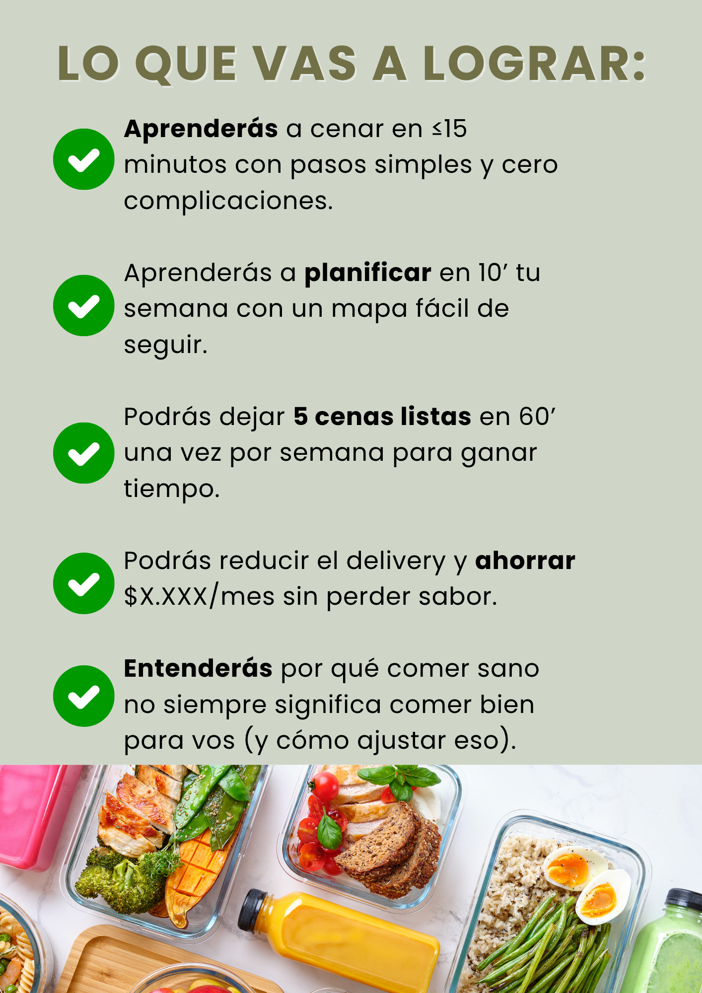 🥗 Si en menos de una semana sentís que el ebook no te brinda herramientas claras, prácticas y aplicables para cenar en 15 minutos, 5 noches por semana, reducir el delivery y comer más liviano…